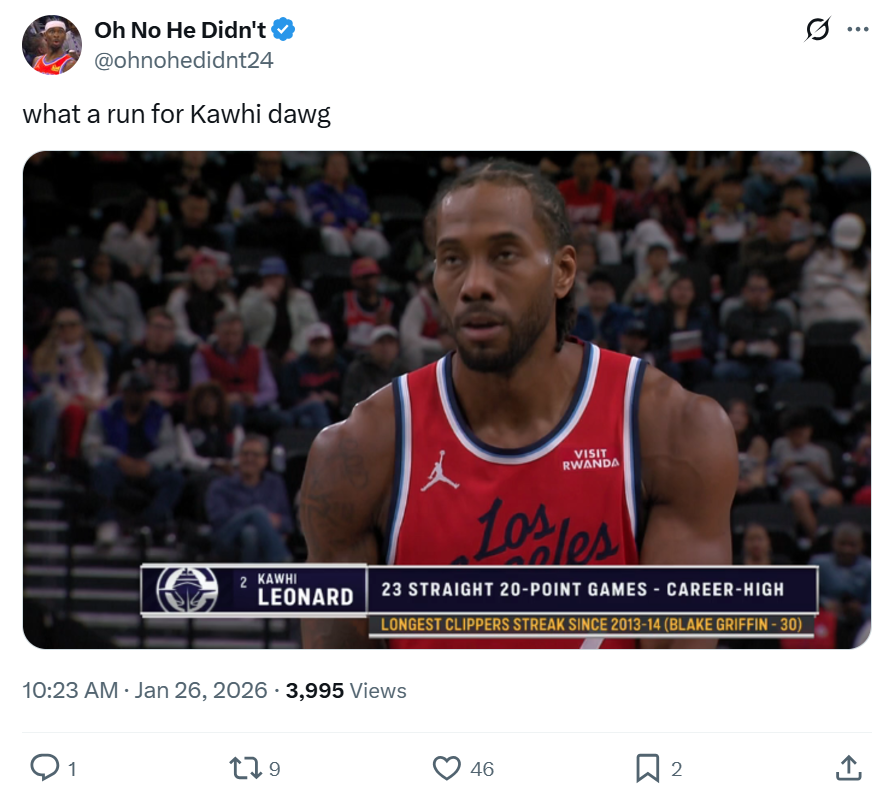 凭借这样的表现,小卡已经连续24场拿到20+得分继续刷新个人新高,也创造13-14赛季格里芬后快船队史最长。