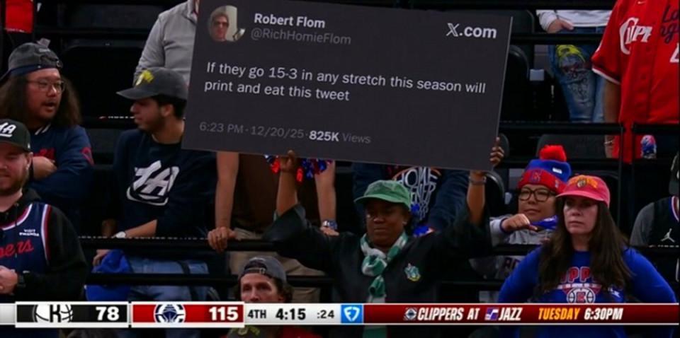 开局快船陷入困境时,一名网友曾公开表示如果本赛季快船任何阶段打出15胜3负表现,自己将打印这条推文并吃掉。